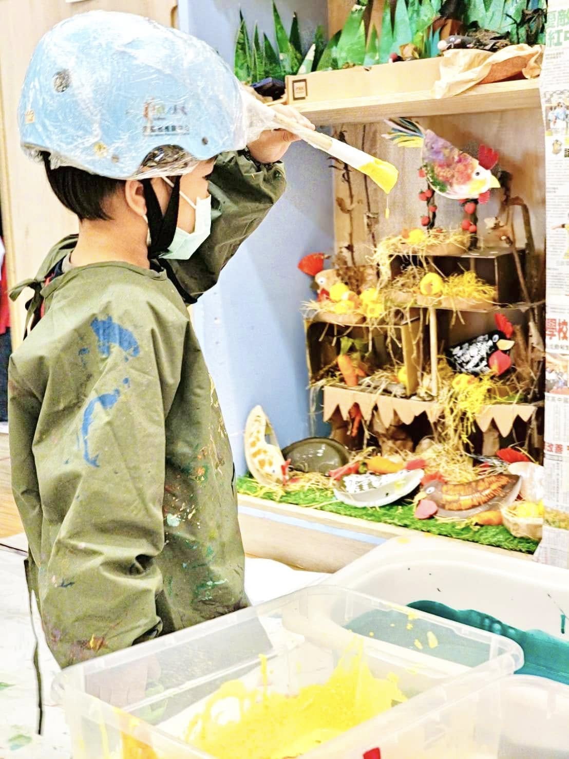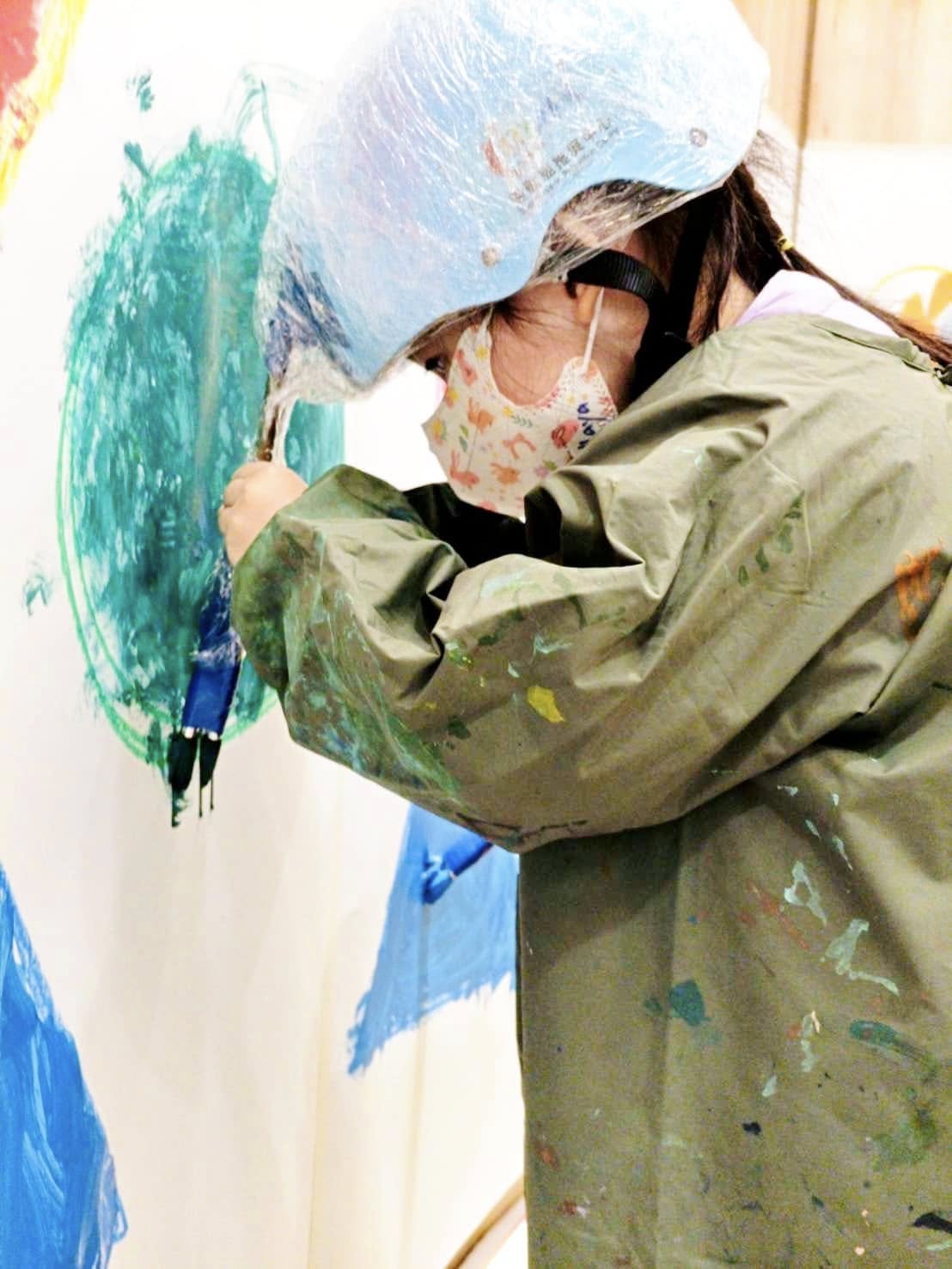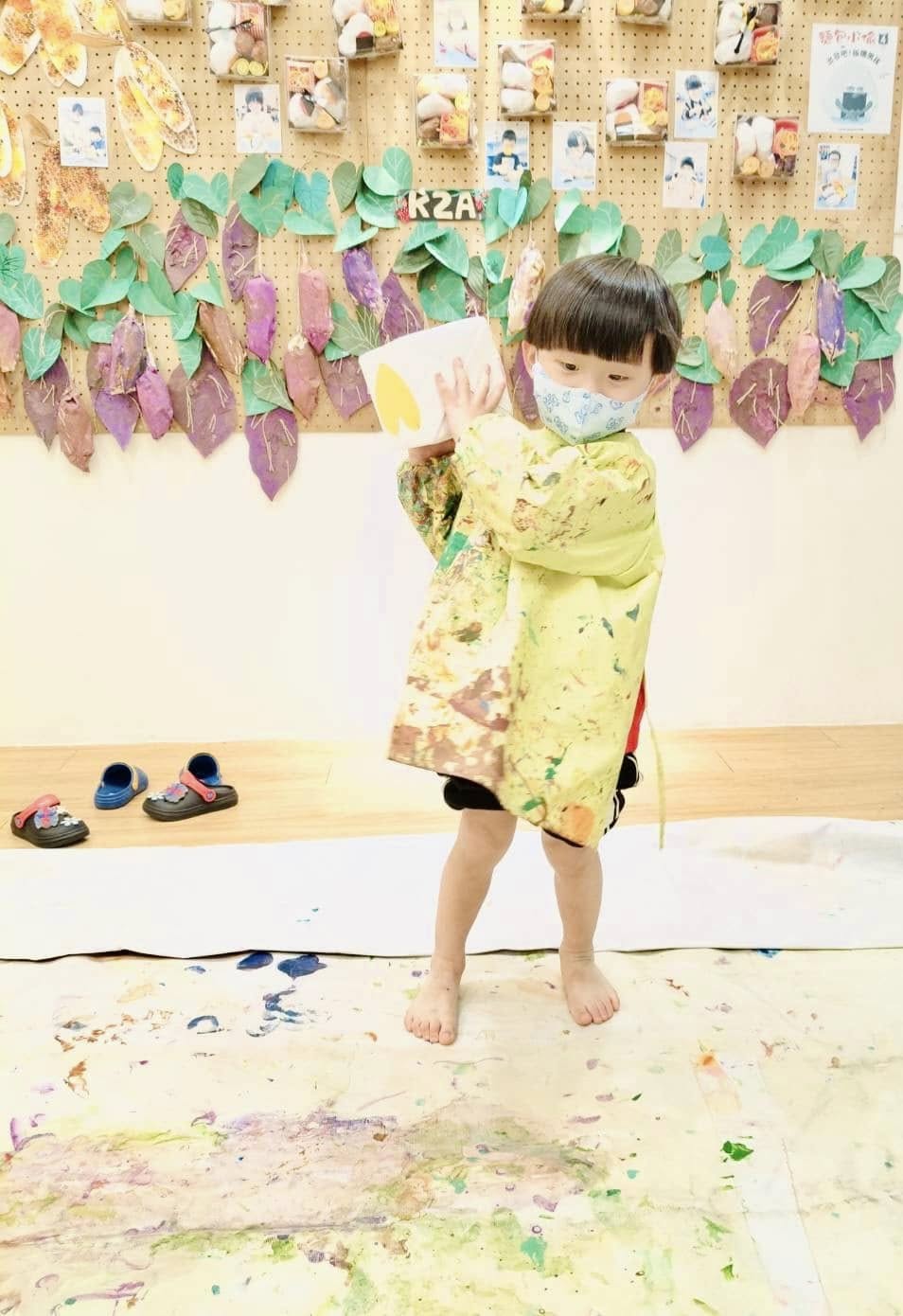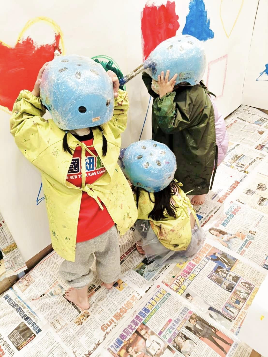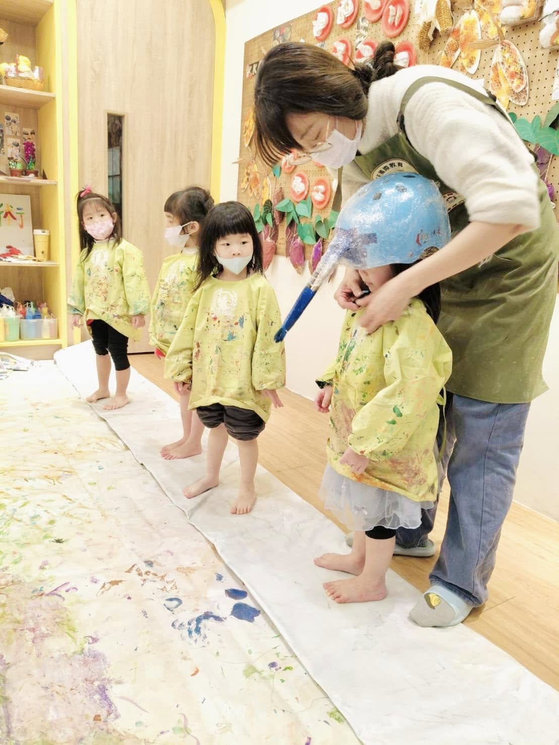 先用腳踏車專用安全帽上面黏上兩枝水彩筆後,固定讓筆在上面不會掉,玩遊戲前先讓小朋友了解遊戲規則,再來穿上畫畫衣脫掉襪子上,依序來擲骰子,擲出相對的顏色和形狀後帶上安全帽。去前方沾取擲骰子的顏料,然後前方牆上的形狀慢慢塗上去完成任務。